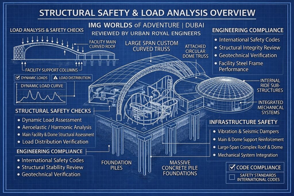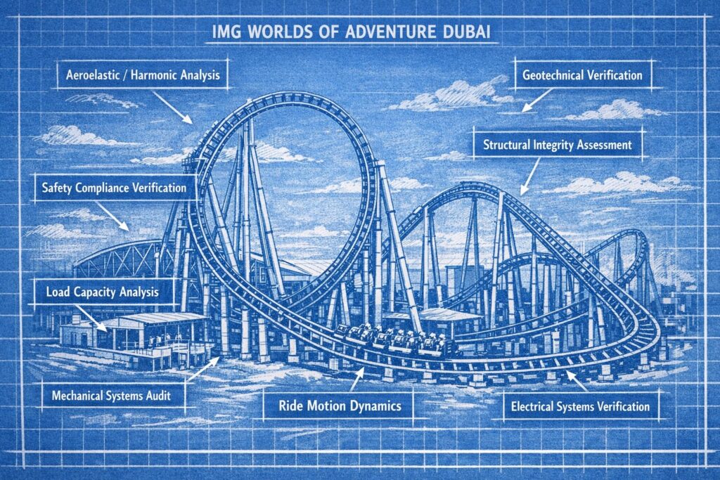 Urban Royal’s review process focused on verifying that the proposed structural systems could safely support all attractions while maintaining long term durability and compliance with international engineering standards.